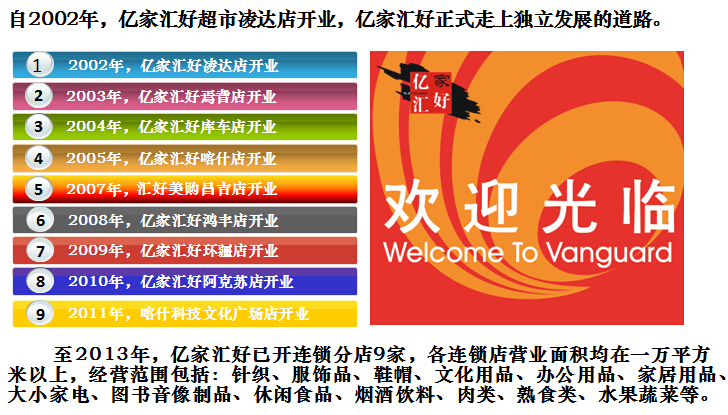 億家匯好商貿有限責任公司于2002年成立,并從臺灣引進連鎖經(jīng)營職業(yè)管理團隊,統(tǒng)一管理旗下各地的連鎖超市。公司通過多年的穩(wěn)健發(fā)展,至2013年底,億家匯好商貿有限責任公司已成為擁有員工近3000多人,下轄一個配送中心和9家連鎖超市的大型綜合性零售企業(yè)??偨?jīng)營面積11萬多平方米,配送中心輻射公司所有超市,年配送額可達2億元。公司大量吸納下崗職工,經(jīng)過崗前培訓,提高勞動技能,實現(xiàn)了他們的再就業(yè),為維護社會和諧穩(wěn)定做出了貢獻。2013年,巴州億家匯好商貿有限責任公司在自治區(qū)零售業(yè)中穩(wěn)踞前三位,是自治區(qū)重要的流通龍頭企業(yè),2013年年銷售收入達10億人民幣。多年來,公司一直重管理、抓實效、運用先進的管理手段和營銷理念,秉承億家匯好人 時時尋求效率創(chuàng)新,事事講究專業(yè)技術的文化精髓,創(chuàng)造了良好的經(jīng)濟效益和社會效益。公司先后多次被消費者協(xié)會評為誠信單位,并多年被評為重合同,守信用單位。